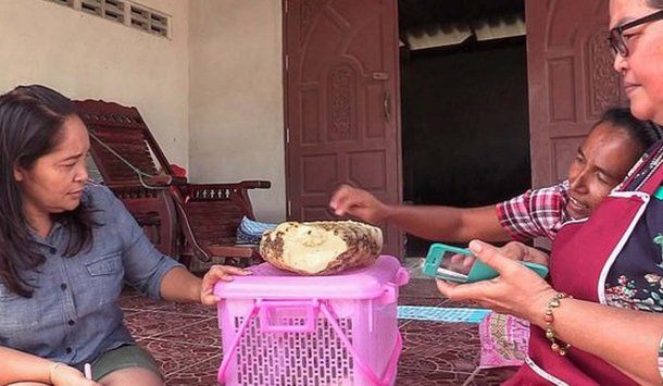 El supuesto conglomerado de "ámbar gris" mide 30 centímetros por 60 centímetros, y Siriporn tuvo que pedir ayuda a sus vecinos para trasladarlo hasta su casa aunque está a unos 500 metros de la playa.
