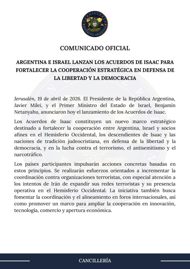 A través de un comunicado de Cancillería, el Gobierno argentino oficializó este domingo el lanzamiento de los “Acuerdos de Isaac”, un entendimiento alcanzado entre el presidente Javier Milei y el primer ministro israelí Benjamin Netanyahu.