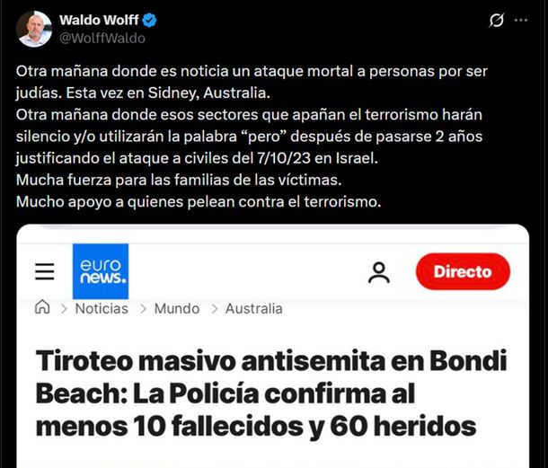 El presidente Javier Milei también manifestó su repudio al atentado ocurrido en Australia a través de sus redes sociales, donde vinculó el ataque con el inicio de la festividad judía de Janucá y expresó su solidaridad con las víctimas.