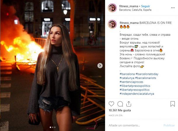Elena Rybalchenko se convirtió en el foco de las críticas tras publicar una insólita imagen en su perfil de Instagram, donde es considerada una influencer bajo el nombre de “Fitness mama”. En medio de las protestas en Barcelona tras la condena a los líderes separatistas, la modelo de nacionalidad rusa compartió una foto donde se la ve posando en la calle con gomas prendidas fuego de fondo y vallas tiradas en el piso.