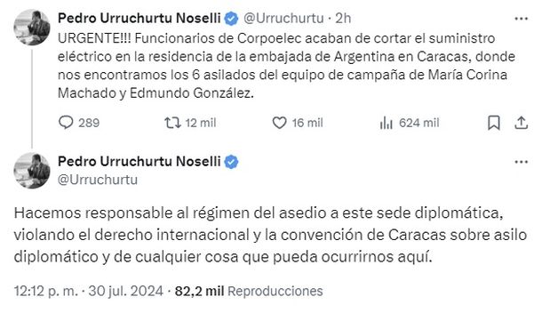 Pedro Urruchurtu Noselli, coordinador nacional de campaña de Machado y González Urrutia, y quien se encuentra asilado en la Embajada argentina, denunció este lunes a través de sus redes sociales: “URGENTE!!! Funcionarios de Corpoelec acaban de cortar el suministro eléctrico en la residencia de la embajada de Argentina en Caracas, donde nos encontramos los 6 asilados”.