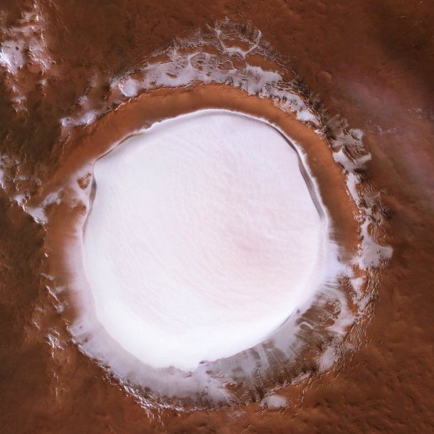 La Agencia Espacial Europea (AEE) publicó esta semana unas imágenes del crácter Korolev, una de las rarezas de la superficie de Marte. Las fotos muestran el accidente topográfico cubierto por una capa de hielo de 1,8 kilómetros de espesor.