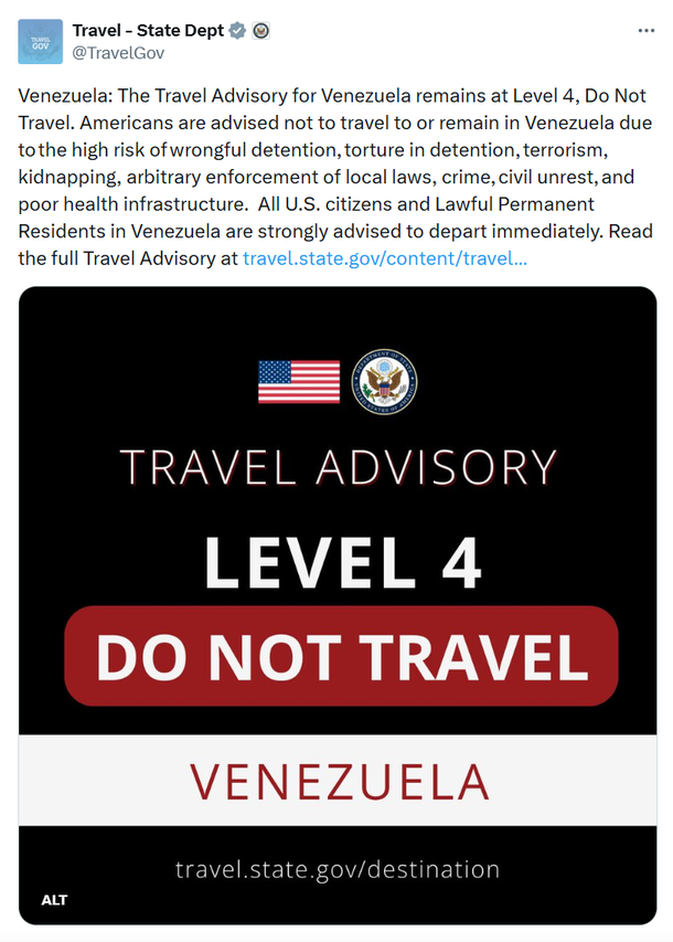 “No viaje ni permanezca en Venezuela debido al alto riesgo de detención injusta, tortura, terrorismo, secuestro, aplicación arbitraria de las leyes locales, delincuencia, disturbios civiles y deficiente infraestructura sanitaria”, indica el comunicado del Departamento de Estado