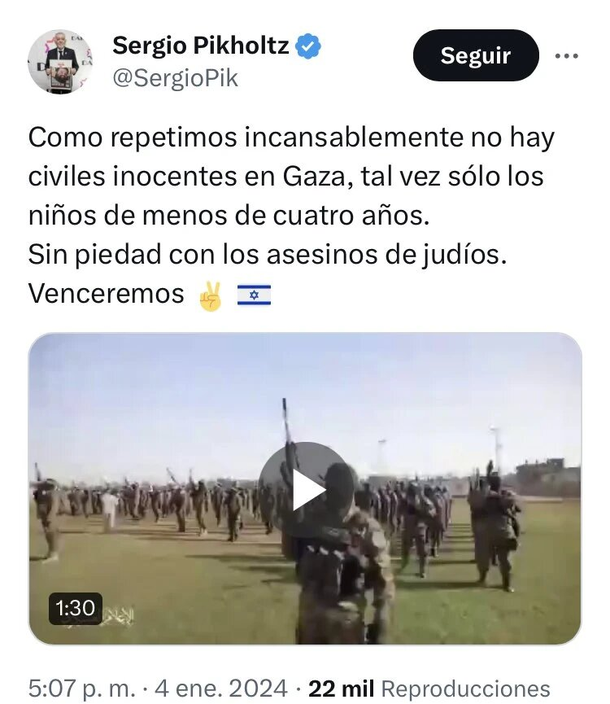 “Como repetimos incansablemente no hay civiles inocentes en Gaza, tal vez sólo los niños de menos de cuatro años. Sin piedad con los asesinos de judíos. Venceremos”, dijo Pikholtz en un mensaje que publicó en su perfil de X al que acompañó con un video.