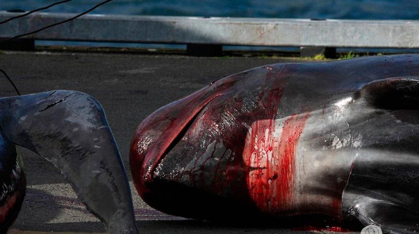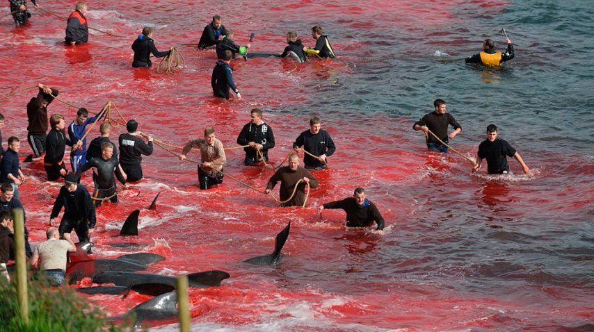 Al menos 250 ballenas piloto -o delfines calderones- fueron empujadas por los pescadores hacia las playas Bøur y Tórshavn, donde murieron arponeadas por los locales y su sangre tiñió el agua de rojo.