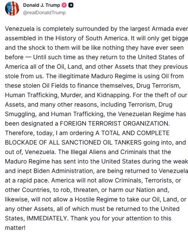 El presidente de los Estados Unidos, Donald Trump, ordenó el bloqueo “total y completo” de todos los buques petroleros sancionados que ingresen o salgan de Venezuela y acusó a Nicolás Maduro de haberle robado petróleo, tierras y otros activos.