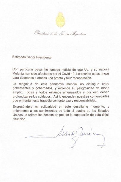 "Con particular pesar he tomado noticia de que usted y su esposa, Melania, han sido afectados por el COVID-19. Le escribo estas líneas para desearles a ambos una pronta y feliz recuperación", inició Alberto Fernández.