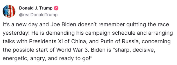 "¡Es un nuevo día y Joe Biden no recuerda haber abandonado la carrera ayer!", escribió el líder republicano en Truth Social.