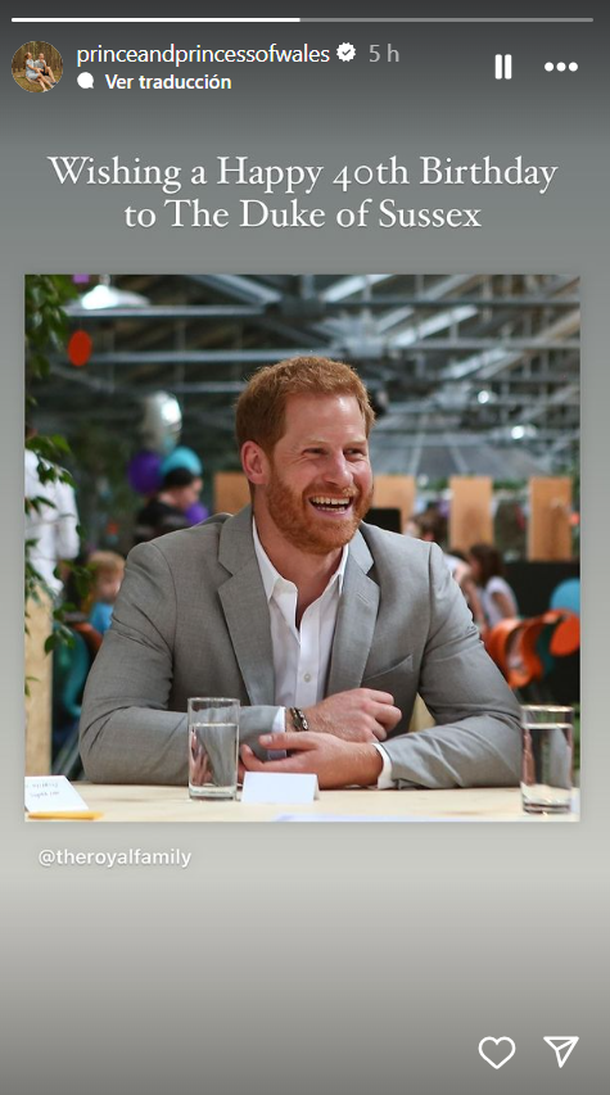 En cuanto al Príncipe William, él fue mucho más escueto y compartió la fotografía que publicaron desde el Instagram oficial de la Casa Real Británica y comentó: "Le deseamos al Duque de Sussex un muy feliz cumpleaños número 40". Hay que destacar que, en más de una ocasión, la relación entre William y Harry se vio muy afectada por distintos comentarios, en especial tras la publicación del libro "En la sombra", en el que el Duque habla del mal vínculo con el heredero al trono.