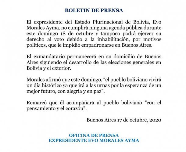 Por su parte, el equipo de prensa del Evo Morales sacó un comunicado informando que el ex mandatario: "no cumplirá ninguna agenda pública durante este domingo 18 de octubre y tampoco podrá ejercer su derecho al voto debido a la inhabilitación, por motivos políticos, que le impidió empadronarse en Buenos Aires".