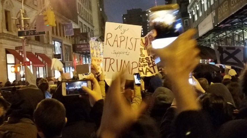 En Nueva York, los manifestantes se reunieron en Union Square con carteles en los que se leía "Love Trump Hate" (Ama, Trump Odia) y "Trump Grabbed America by the Pussy!" (Trump tomó a EEUU por la vagina) dirigiéndose luego hacia el edificio Trump Tower.