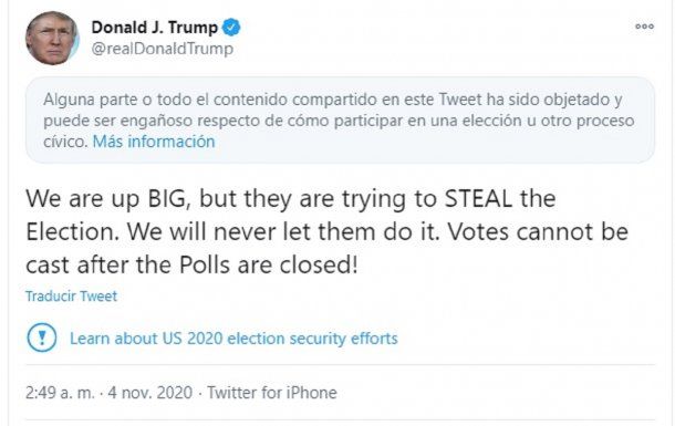"Estamos muy arriba, pero están tratando de robar las elecciones. Nunca les dejaremos hacerlo. ¡No se pueden emitir votos después de que se cierran las urnas!", tuiteó esta noche el presidente Donald Trump respecto al recuento de las elecciones en Estados Unidos, donde compite con Joe Biden. En pocos minutos, Twitter sancionó el posteo advirtiendo sobre su contenido.