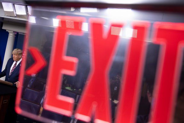 El presidente de y candidato republicano Donald Trump, insistió esta noche en que hubo "fraude" en los comicios de ese país y reiteró sus intenciones de recurrir a la Justicia para denunciar "manipulación" en el recuento de votos de las elecciones en Estados Unidos. Más allá de sus declaraciones, se viralizaron imágenes de fotoperiodistas que con la lente de sus cámaras mezclaron la imagen del magnate con un cartel de "EXIT" que le mostraba la salida.