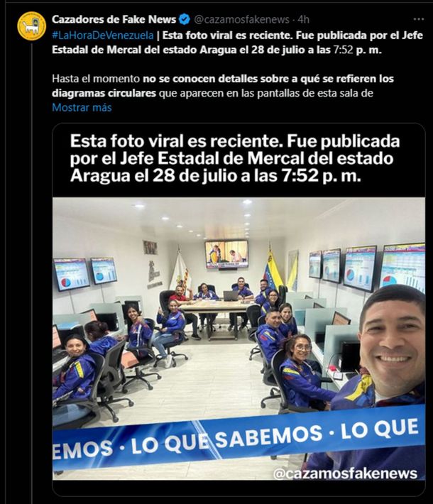 "Esta foto viral es reciente. Fue publicada por el Jefe Estadal de Mercal del estado Aragua el 28 de julio a las 7:52 p. m. Hasta el momento no se conocen detalles sobre a qué se refieren los diagramas circulares que aparecen en las pantallas de esta sala de monitoreo. Pero la foto sí es reciente. Fue publicada anoche en la cuenta de Instagram de Rubén Flores, Jefe Estadal de Mercal (uno de los programas sociales del gobierno) del estado Aragua", informaron en la cuenta de X "Cazadores de fake news".