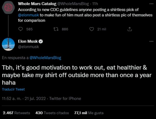 Y sorprendentemente recibió la respuesta de Musk: "Para ser sincero, es una buena motivación para hacer ejercicio, comer más sano y tal vez quitarme la camisa más de una vez al año, jaja", bromeó el magnate.