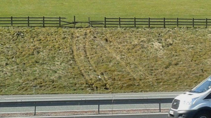 Aunque Don puso sus patas sobre el volante, el pobre can no pudo mantener el control sobre el vehículo y cruzó la autopista M74 a la altura de la localidad de Abington, al sur de Lanarkshire. Las marcas del tractor todavía se pueden ver en el costado de la ruta.