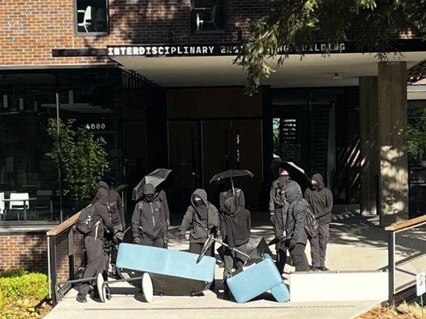 El vocero de la Universidad de Washington, Victor Balta, aseguró que "individuos que llevaban la cara prácticamente cubierta impidieron el acceso a dos calles en el exterior del edificio, bloquearon las entradas y salidas del edificio e iniciaron incendios en dos contenedores de basura en una calle exterior".