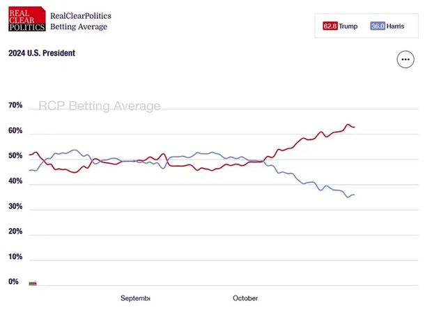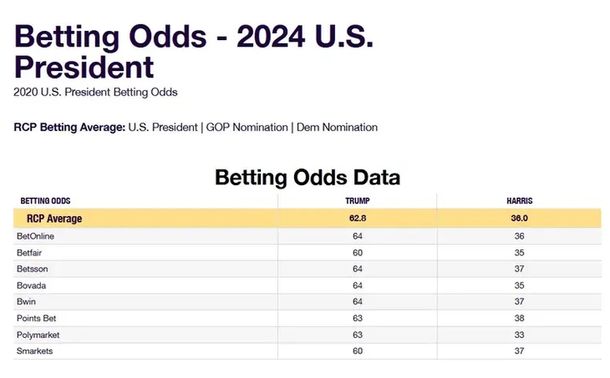Real Clear Politics relevó a las principales casas de apuestas de los Estados Unidos. El promedio de todas le da a Donald Trump un 62% de posibilidades de volver a la Casa Blanca, mientras en el caso de la actual vicepresidenta (de cuestionable gestión junto a Joe Biden) los guarismos promedian el 36%.