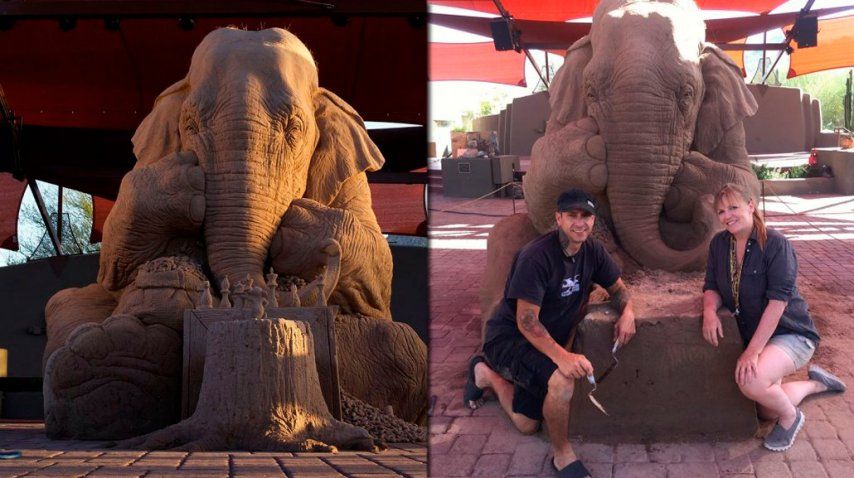 La asombrosa escultura de arena de un elefante y un ratón jugando al ajedrez