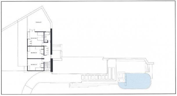 El diseño se resolvió alrededor de la chimenea por considerarla el lugar de reunión de la familia. Además, los cimientos está hecho con rocas del lugar, y algunas sobrepasan el ancho forjado de la primera planta asomándose junto a la chimenea, lo que trae la cascada al interior.