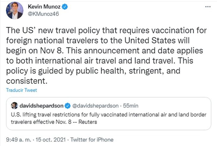 “La nueva política de viajes, que requiere la vacunación de los viajeros extranjeros a los Estados Unidos, comenzará el 8 de noviembre”, confirmó este viernes el Secretario de Prensa adjunto de la Casa Blanca, Kevin Muñoz a través de su cuenta de Twitter.
