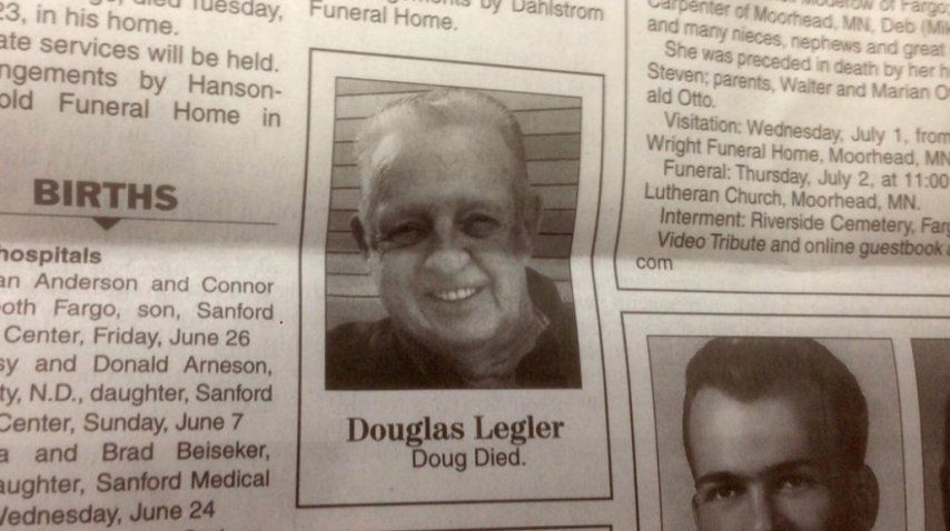 En su lugar, el aviso fúnebre de Legler contiene dos palabras: "Doug murió", y así fue publicado en el sitio Inforum por su hija, Janet Stoll.