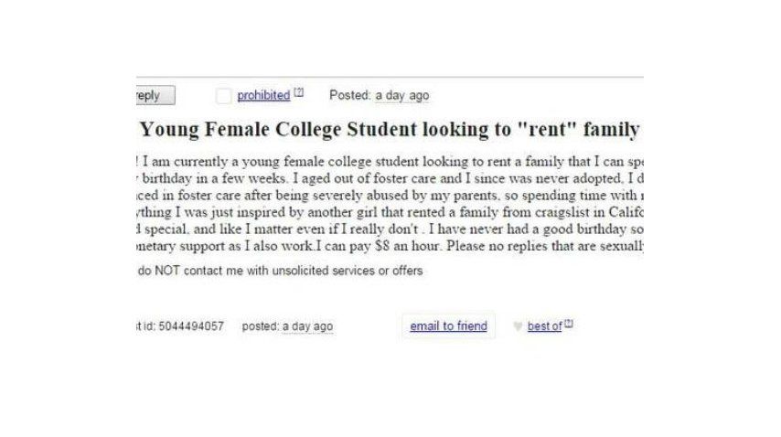 Una chica de Colorado, en los Estados Unidos, publicó esta semana un anuncio muy particular en el sitio de clasificados Craiglist con el objeto de alquilar una familia que la reciba en el día de su cumpleaños, el próximo 10 de junio.