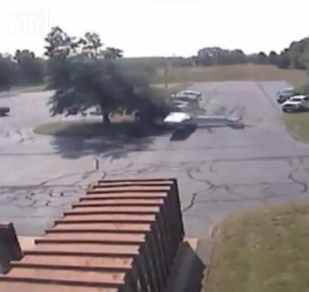 Las cámaras de seguridad de la policía local registraron a la avioneta, Cessna 172, en el momento en Forst trató de estabilizarla, no pudo y entonces se estrelló contra un árbol en el estacionamiento lindero al aeropuerto.