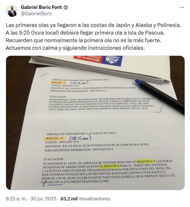 "Las primeras olas ya llegaron a las costas de Japón y Alaska y Polinesia. A las 9:25 (hora insular) debiera llegar primera ola a Isla de Pascua. Recuerden que normalmente la primera ola no es la más fuerte. Actuemos con calma y siguiendo instrucciones oficiales", expresó el presidente chileno Gabriel Boric en sus redes sociales.