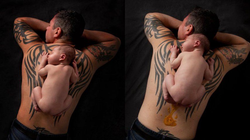 Pero justo antes de que la fotógrafa Gigi de Bradenton, Florida, comenzara con su labor, Asher decidió descargar tensiones -y el contenido de sus tripas- sobre la espalda de su papá. La imagen accidentada fue compartida a través de Facebook y se convirtió en el viral más tierno y asqueroso de la semana.