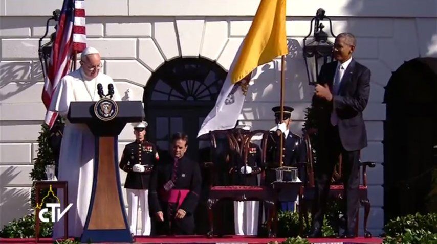 El presidente de EEUU y su esposa Michelle saludaron desde el balcón de la Casa Blanca a los 15.000 invitados a la ceremonia oficial de bienvenida al pontífice, que marca el inicio de su agenda oficial en el país.