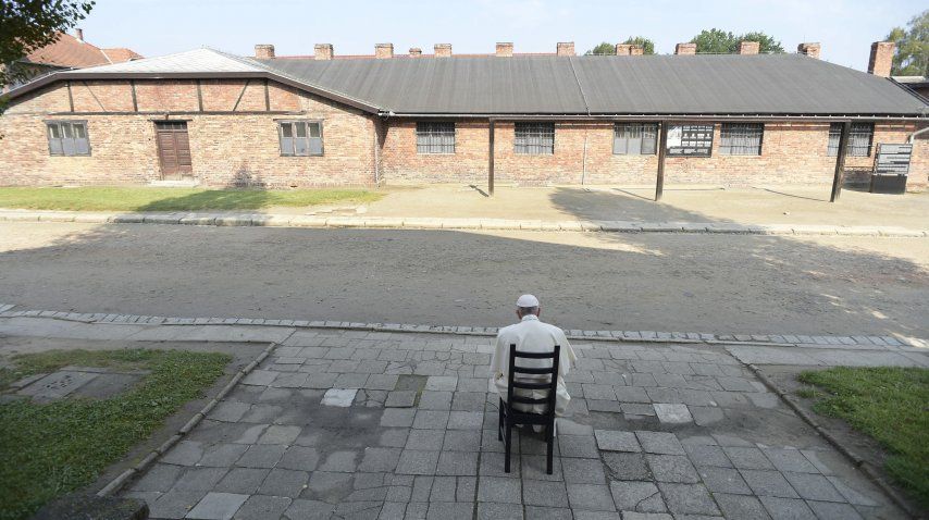 Antes de firmar el libro, Francisco saludo a once sobrevivientes del Holocausto y se sentó solo, en silencio y con los ojos cerrados durante más de diez minutos en uno de los bancos del campo de exterminio ubicado a 66 kilómetros de Cracovia, donde llegó el miércoles para una visita de cinco días a Polonia durante la que participa de la XXXI Jornada Mundial de la Juventud.