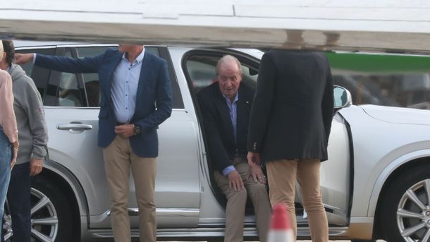 Juan Carlos de Borbón llegó en un avión privado al aeropuerto de Vigo, en Galicia, donde fue recibido con un abrazo por una de sus hijas, la infanta Elena.