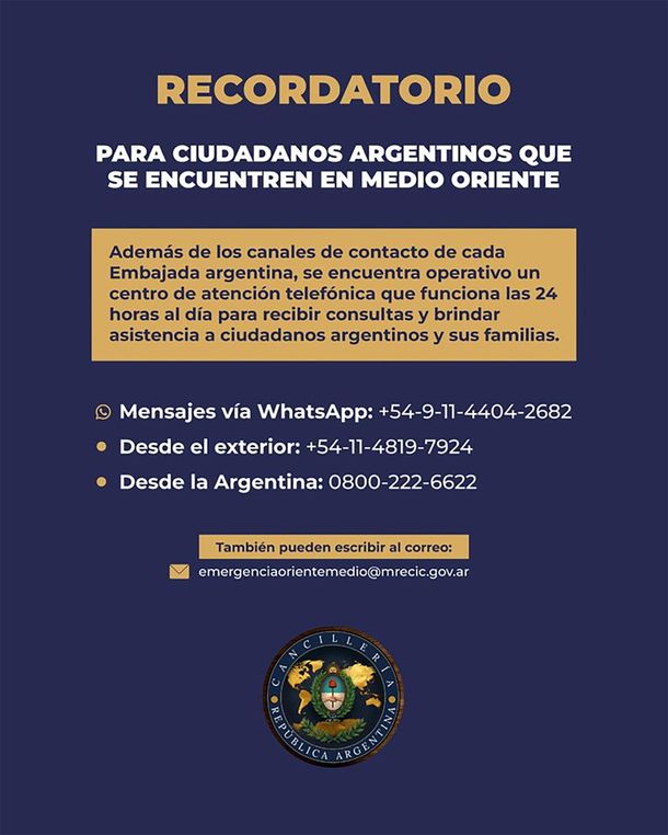 También precisó que “además de los canales de contacto de cada Embajada argentina, se encuentra operativo un centro de atención telefónica que funciona las 24 horas al día para recibir consultas y brindar asistencia a ciudadanos argentinos y sus familias”.