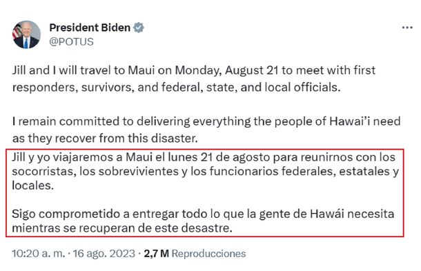 "Sigo comprometido en dar todo lo que la gente de Hawái necesita mientras se recuperan de este desastre", dijo el presidente en sus redes sociales.