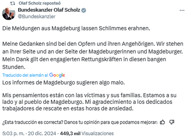 En este sentido, se pronunció el canciller alemán, Olaf Scholz, quien escribió un sentido mensaje en su cuenta de la red social X: "Los informes de Magdeburgo sugieren algo malo", comenzó indicando. Y agregó: "Mis pensamientos están con las víctimas y sus familias. Estamos a su lado y al pueblo de Magdeburgo. Mi agradecimiento a los dedicados trabajadores de rescate en estas horas de ansiedad".