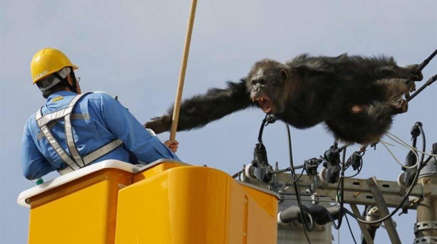 Un chimpancé se secapó del zoológico de Sendai, en la Prefectura de Miyagi, Japón, y causó una situación apremiante este jueves debido a que se pasó dos horas colgado de unos cables de alta tensión hasta que alguien lo sedó y logró bajarlo.