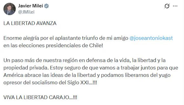 En este sentido, por un lado, el presidente Javier Milei utilizó su cuenta de X para manifestar su entusiasmo, celebrando "el aplastante triunfo de su amigo" Kast.