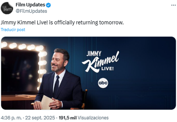Otro, en tanto, posteó: "Es bueno escuchar esto. Mis padres estarán felices". Mientras que otro internauta advirtió: "Mejor que no se disculpe, porque no hizo nada malo", en referencia a Jimmy Kimmel y la expectativa que genera cómo encarará su regreso a la pantalla.