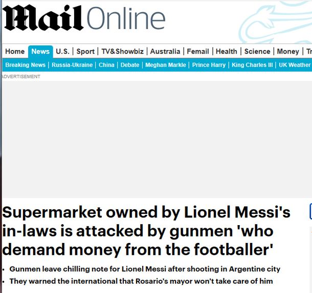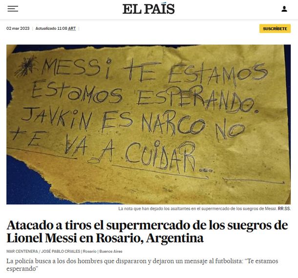 El País de España tituló: "Atacado a tiros el supermercado de los suegros de Lionel Messi en Rosario, Argentina", junto a la foto con la amenaza escrita.