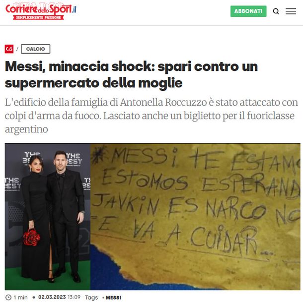 El Corriere dello Sport de Italia, señaló: "Messi amenaza y conmoción: Tiroteos contra el supermercado de su mujer", y decidieron ilustrar la noticia con el mensaje mafioso.