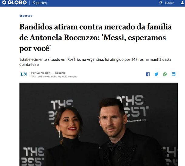 Por su parte, el medio más leído de Brasil, O'Globo, reflejó: "Bandidos disparan contra el mercado de la familia de Antonela Roccuzzo: 'Messi, te estamos esperado'".