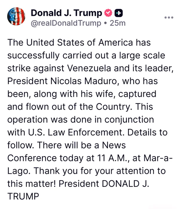 En su publicación, Trump afirmó que “los Estados Unidos de América llevaron a cabo con éxito un ataque a gran escala contra Venezuela y su líder, el presidente Nicolás Maduro”, y precisó que el mandatario venezolano “fue, junto con su esposa, capturado y trasladado fuera del país”.