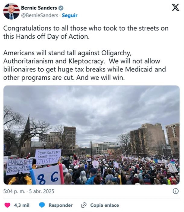 Por su parte, el senador Bernie Sanders celebró la masividad de la protesta al advertir en redes sociales que “no permitiremos que los multimillonarios obtengan enormes exenciones fiscales mientras se recortan Medicaid y otros programas. Y vamos a ganar”.