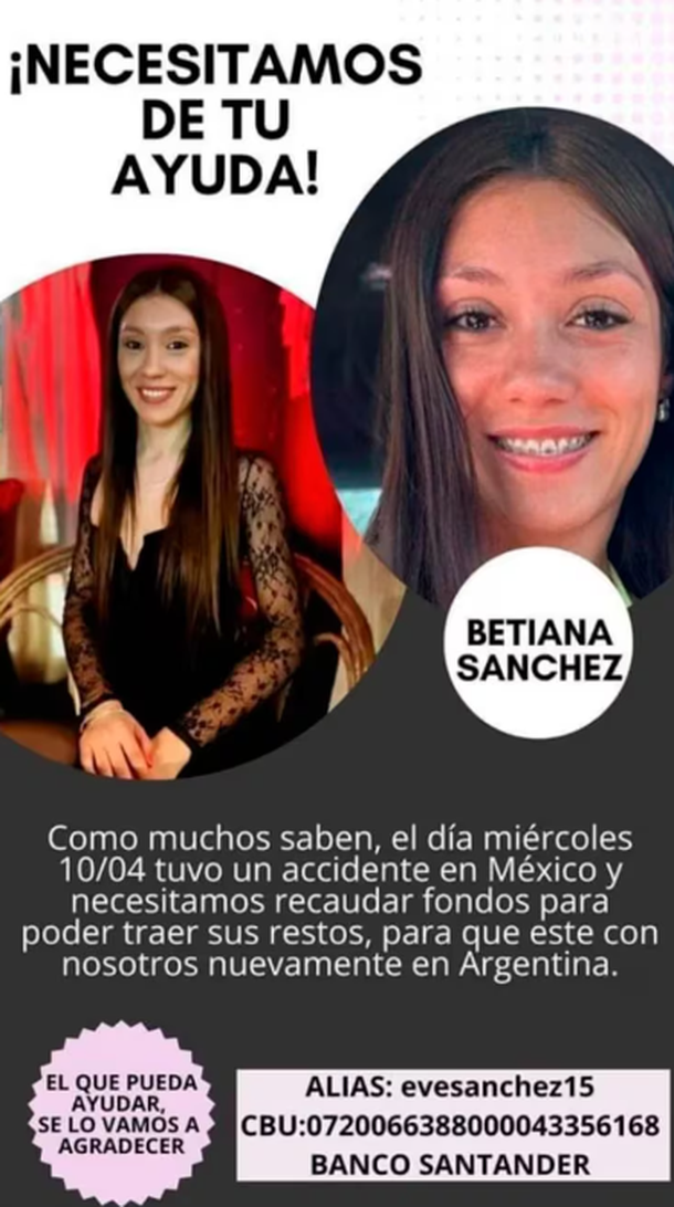 La víctima fue identificada como Betiana Sánchez y era oriunda de Córdoba. Según indicaron las fuentes, vivía en la zona de Yucatán de ese país, desde hacía varios meses. Trabajaba en una empresa de alquiler de autos y el recorrido que realizaba hacia Playa del Carmen, momento en el que ocurrió la tragedia, fue en medio de tareas laborales.