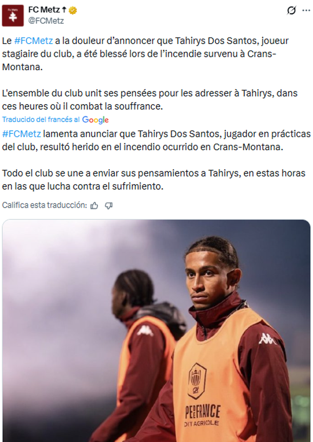 La conmoción sacudió al fútbol francés y europeo en las primeras horas de 2026. Tahirys Dos Santos, defensor del FC Metz y una de las jóvenes promesas del club, resultó gravemente herido en el incendio que destruyó un bar en la localidad suiza de Crans-Montana. El episodio ocurrió durante los festejos de Año Nuevo y dejó un saldo estremecedor: decenas de víctimas fatales y más de un centenar de heridos, entre ellos el futbolista de apenas 19 años.