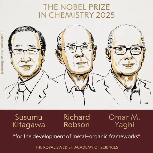 La Real Academia de Ciencias de Suecia otorgó este miércoles el Premio Nobel de Química 2025 al japonés Susumu Kitagawa, el británico Richard Robson y el jordano Omar Yaghi “por el desarrollo de estructuras metalorgánicas”, una nueva arquitectura molecular.