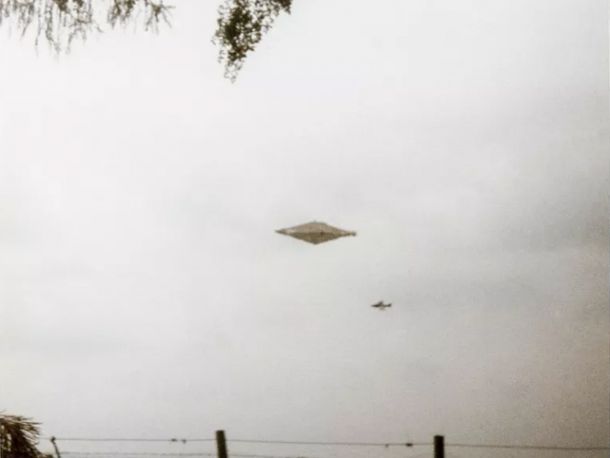 Catalogada como “la mejor foto de un OVNI”, la imagen muestra un objeto con forma de diamante volando en el cielo acompañado por un avión de combate. Para cerciorarse de que no se tratara de una falsificación, Clarke hizo analizarla por un experto en fotografía que determinó que no existió manipulación.