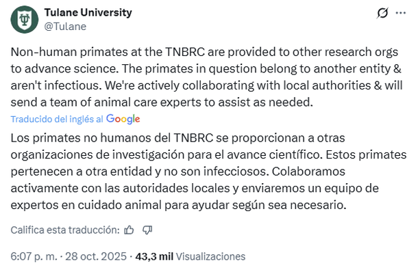 Además, si bien en un principio se indicó que los monos estaban siendo trasladados desde la Universidad de Tulane, la institución educativa desmintió este dato: “Estos primates pertenecen a otra entidad y no son infecciosos. Colaboramos activamente con las autoridades locales y enviaremos un equipo de expertos en cuidado animal para ayudar según sea necesario”, dijeron en un breve comunicado publicado en X.