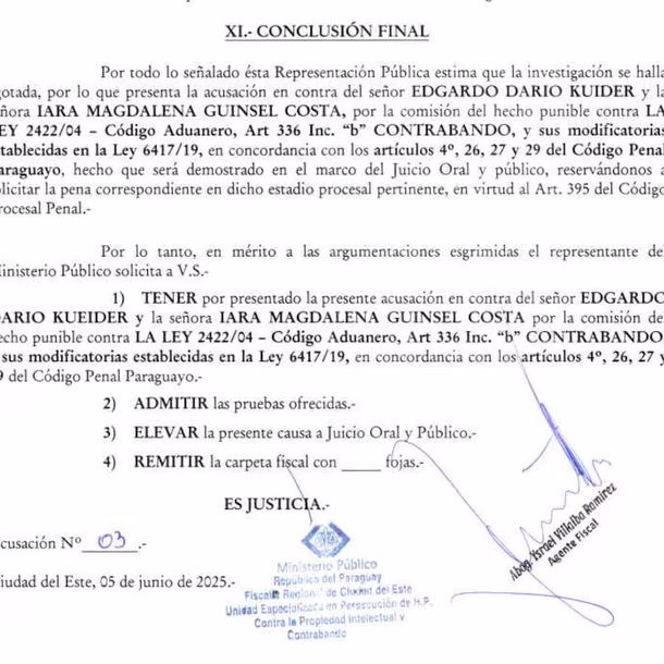 La imputación llegó al cumplirse exactamente seis meses de su arresto, ocurrido cuando intentó cruzar desde Brasil a territorio paraguayo transportando 211 mil dólares estadounidenses sin declarar, lo que derivó en una causa penal que ahora deberá resolverse en juicio oral.